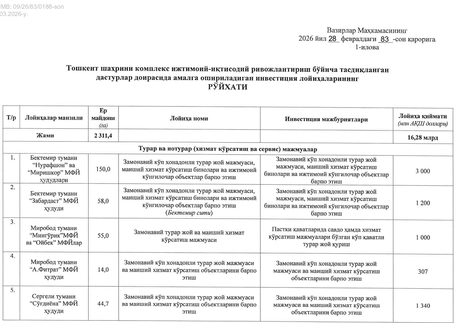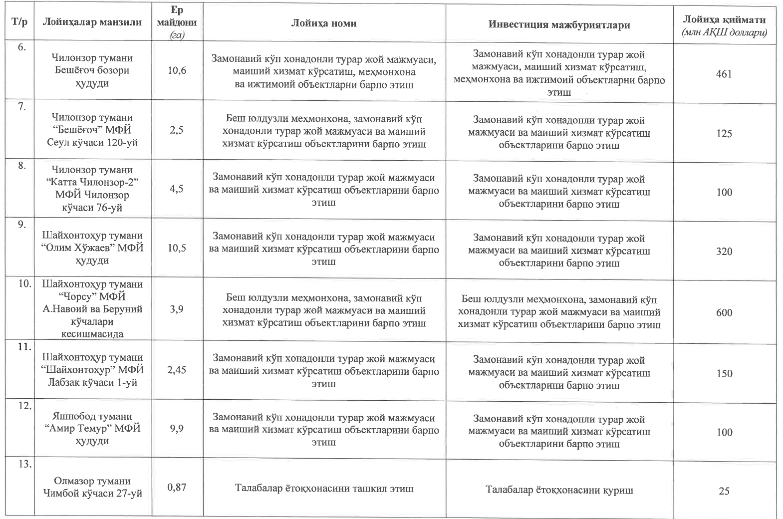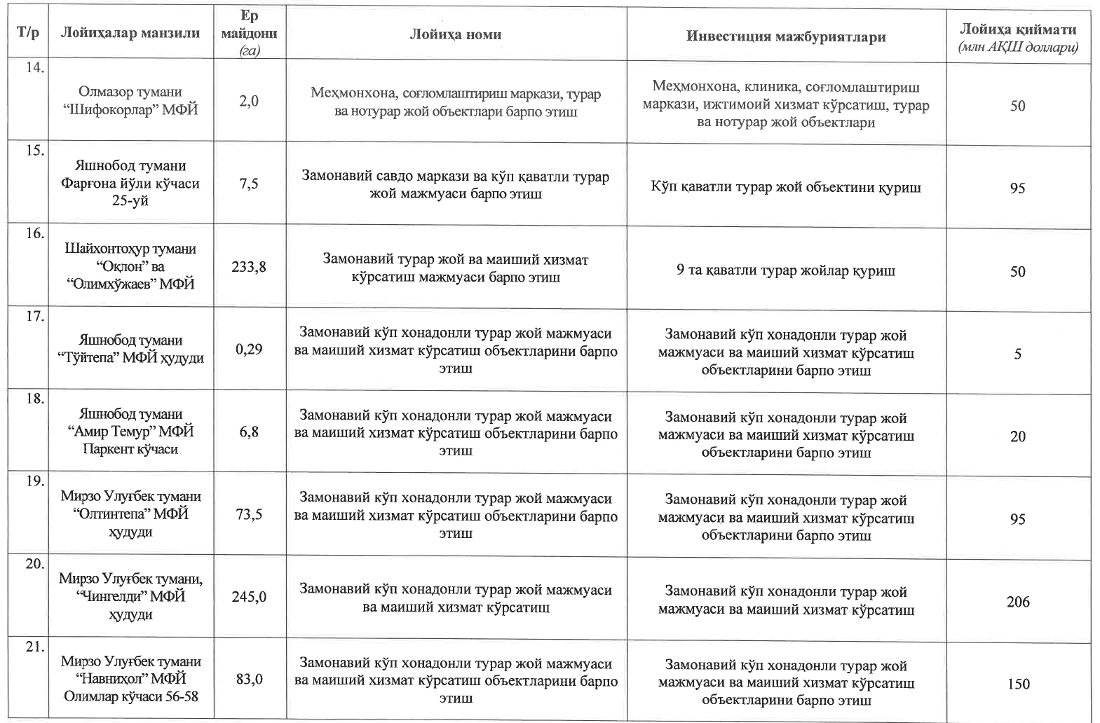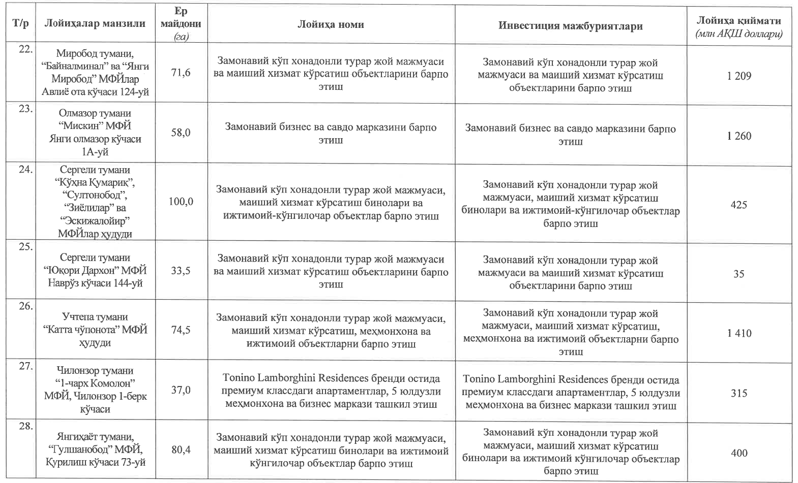 Постановлением утвержден перечень 30 крупных проектов недвижимости (жилых и нежилых комплексов), реализуемых иностранными и местными инвесторами на земельных участках площадью 1512 гектаров в городе Ташкенте, общей стоимостью 14,5 млрд долларов.